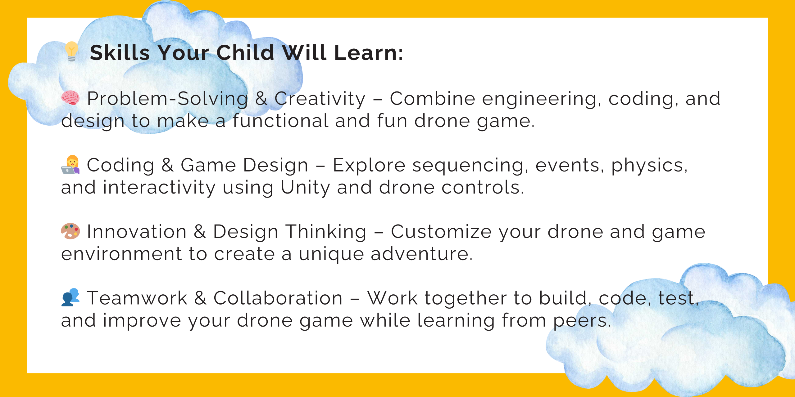 👩💻 Coding & Game Design – Explore sequencing, events, physics, and interactivity using Unity and drone controls.