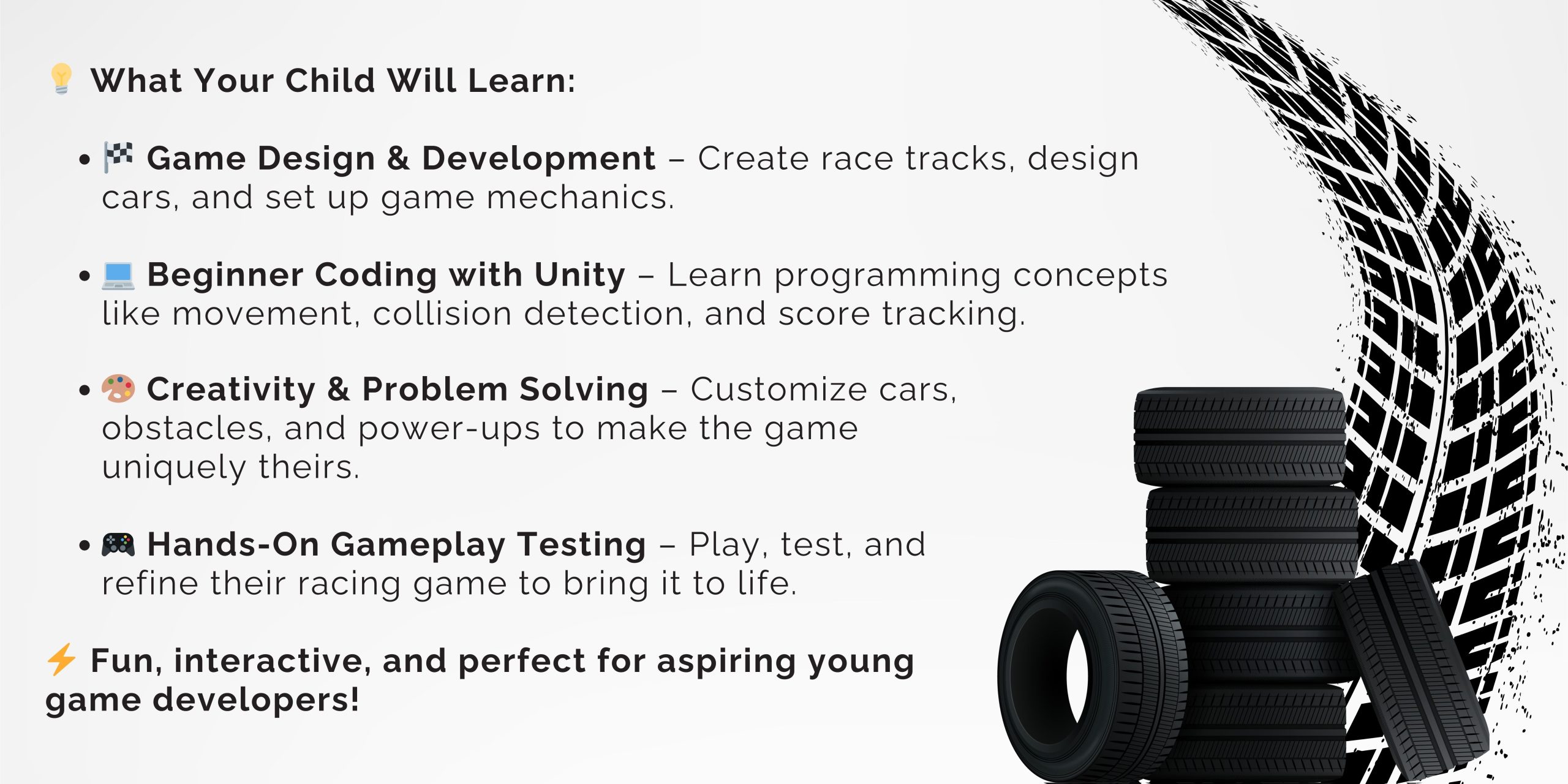 👩💻 Coding & Game Design – Learn key concepts like controls, physics, collisions, and interactivity using Unity and car mechanics.