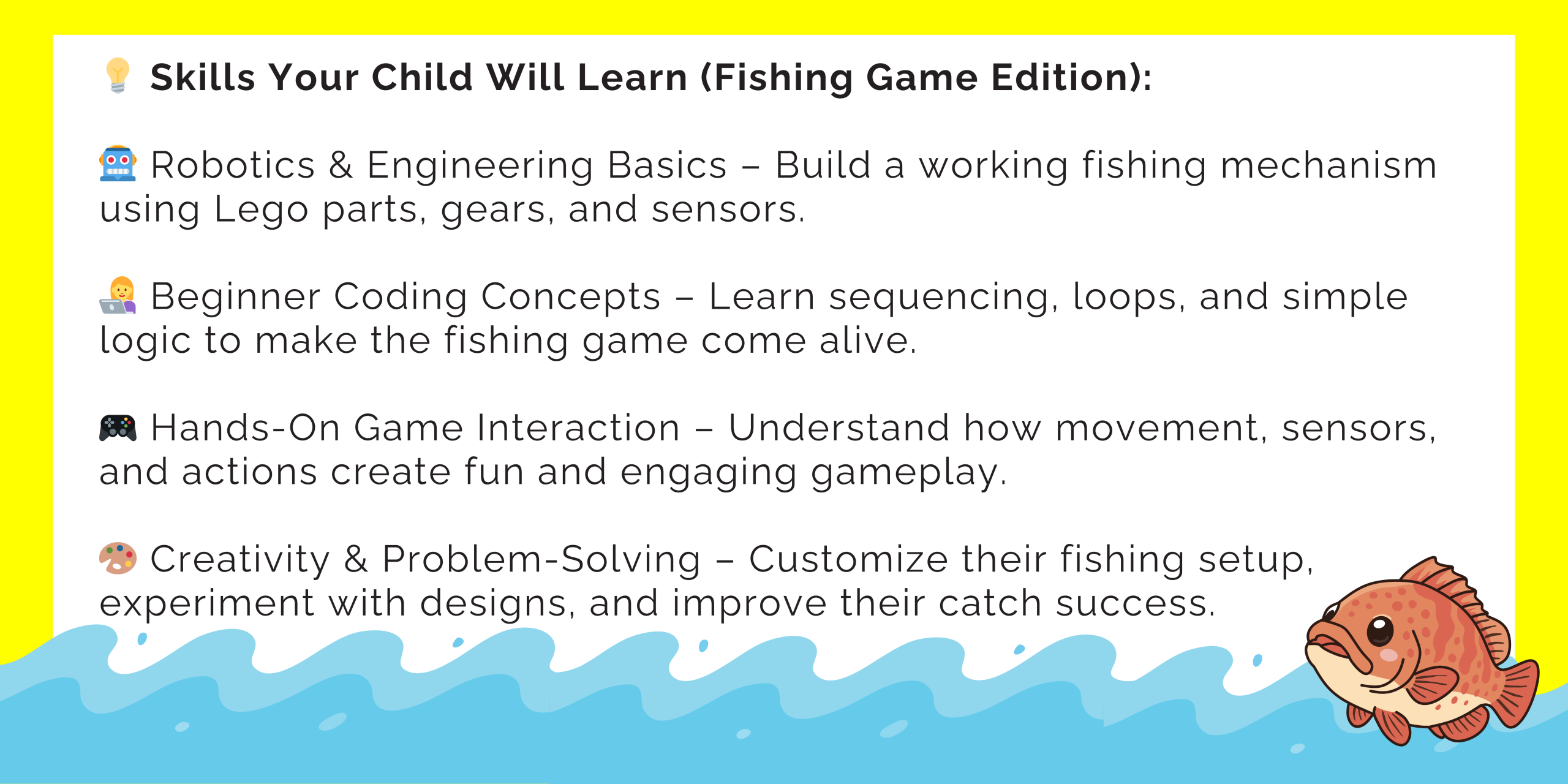 🧱 Build & Code the Action – Use LEGO robotics to construct your fishing mechanism and code it to reel in fish at just the right moment.