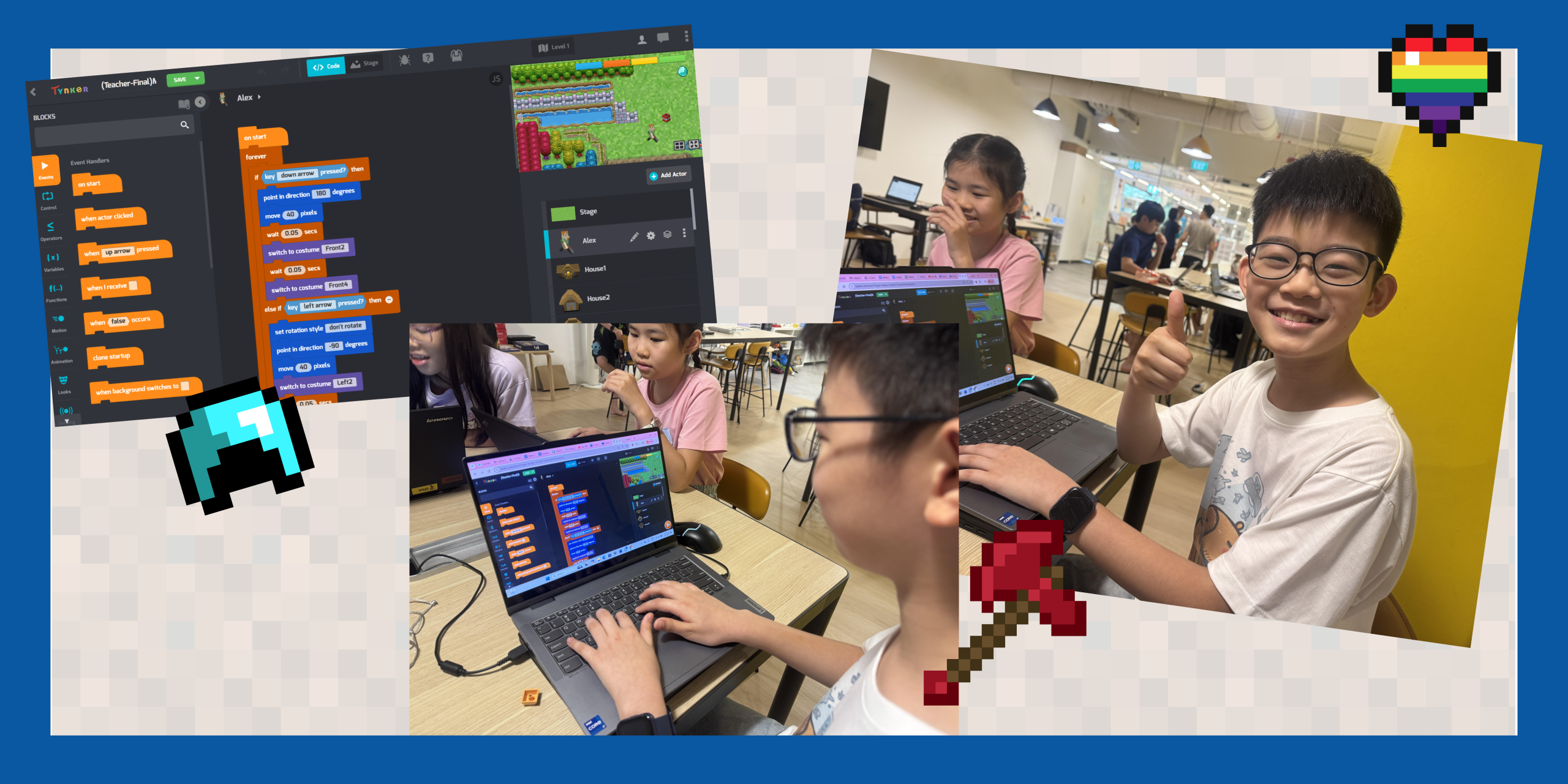 ⚔️ Day 2: Master Interactivity & Challenges – Join Ash on a treasure-hunting quest! Students learn advanced coding concepts like variables, timing, and enemy design, while battling TNT and creepers in their games.