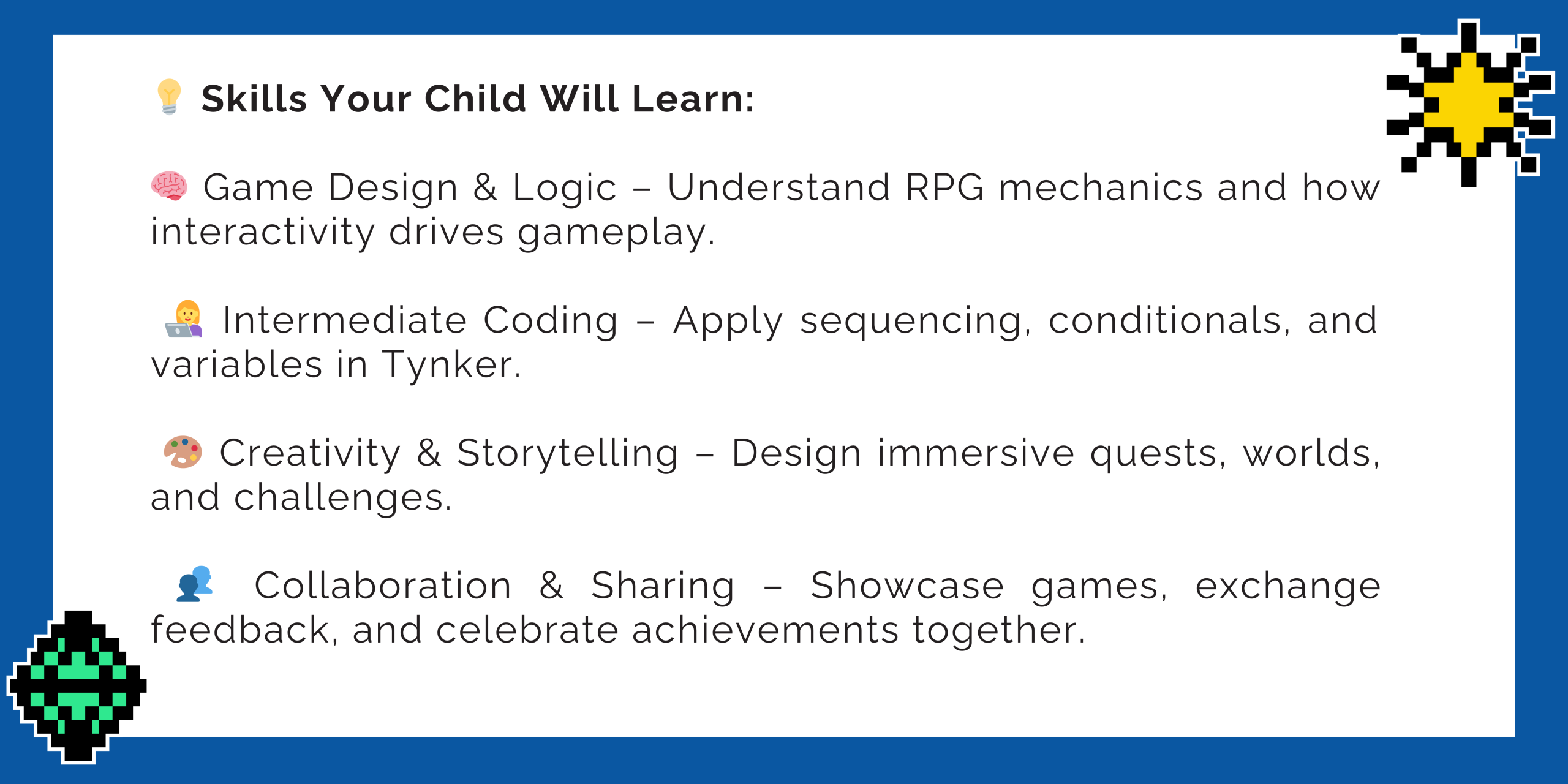 🗺️ Day 1: Dive into Epic RPGs – Step into the world of Minecraft RPGs with Tynker! Students craft Alex’s world, learn the secrets of RPG design, and unleash creativity with sounds, scores, and custom levels.