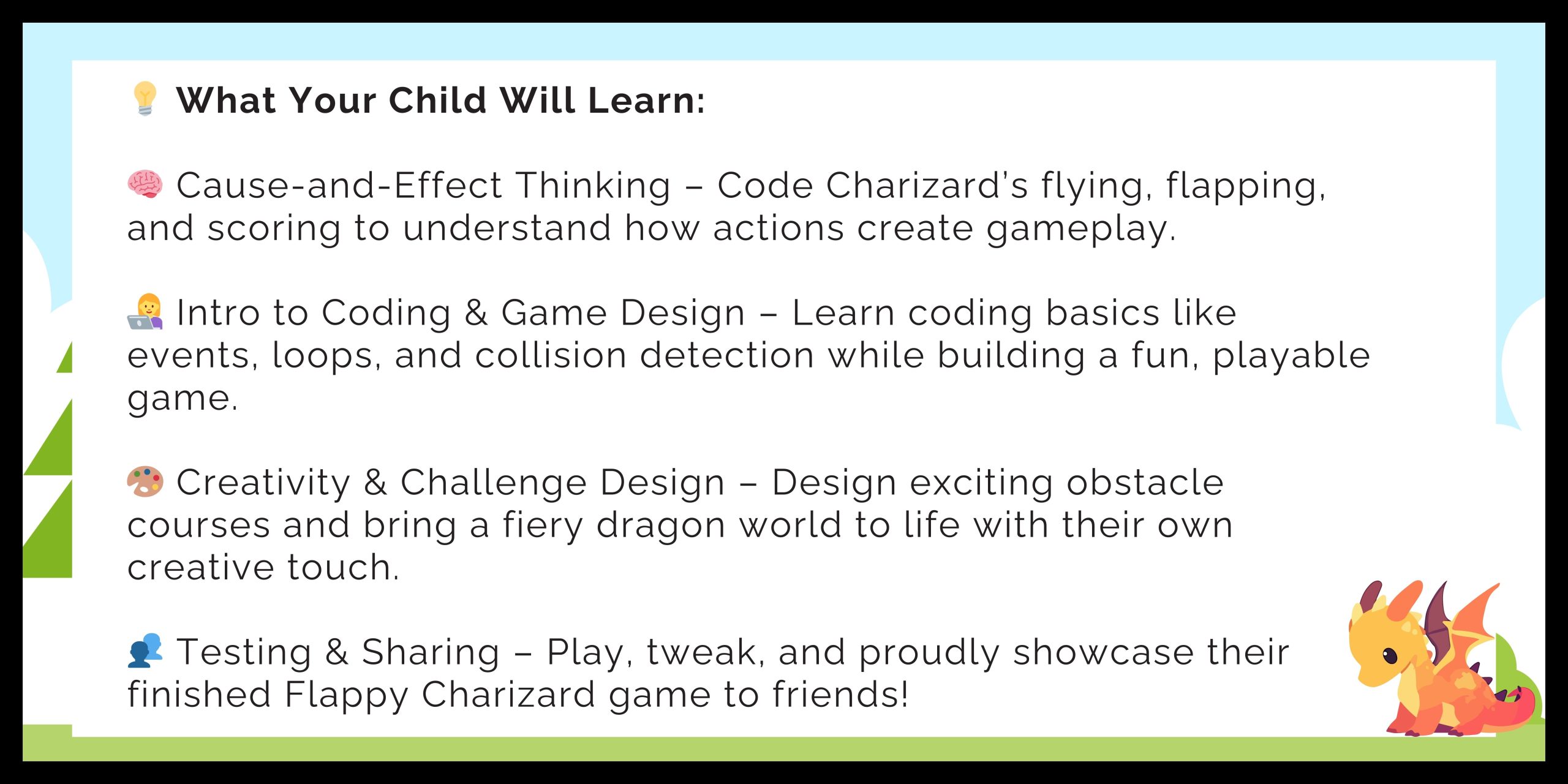 👩💻 Coding & Game Mechanics – Explore sequencing, loops, conditionals, and collision detection while programming Charizard’s flaps, obstacles, and scoring system.